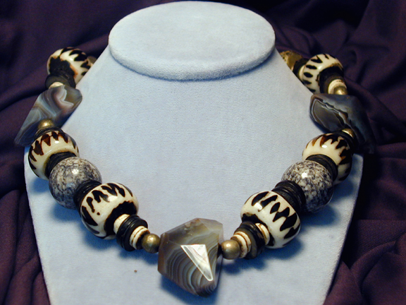 brass beads, and African “mudcloth” bone beads. Finished with ostrich