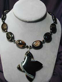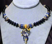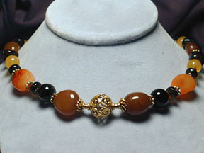 night blossoms. Here black onyx, yellow jade, snowy white quartz, blue