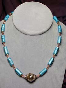 bright turquoise raised relief art glass tubes, tiny pink freshwater