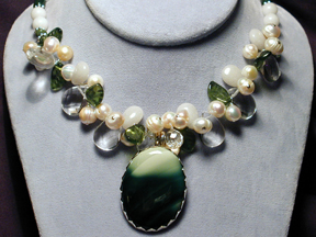 freshwater pearls, green goldstone, and Czech glass seed beads, all