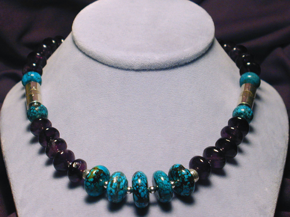 colors. Puffed turquoise ovals lead the eye to two genuine amethyst