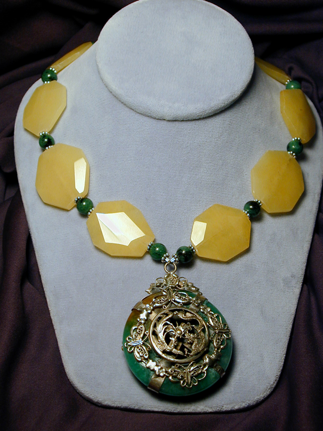 yellow/green jade, silver-chased with dragons, is hung upon a strand of