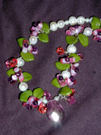 briolettes. Mixed among them are green Czech art glass leaves, and